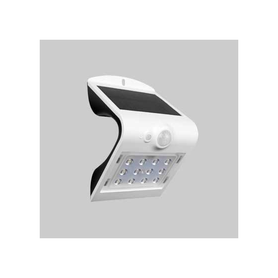 APPLIQUE A LED CON PANNELLO SOLARE E SENSORE 3W - 200Lm - 6000K - Colore Bianco - Corpo in PBT (polibutilentereftalato) resistente agli urti. Dotato di batteria a Litio da 3.7V - 1200mA. Tempo di ricarica 4/6h. Autonomia 12/16h. Dotato di sensore PIR, ad accensione automatica per 10 secondi. Angolo di rilevamento 120°. Raggio di azione 2-6 m. Grado di protezione IP65. Applicazione: Cortili, Balconi, Giardini, Vicoli, Illuminazione generica delle aree esterne. Dimensione: 152x96x83h.