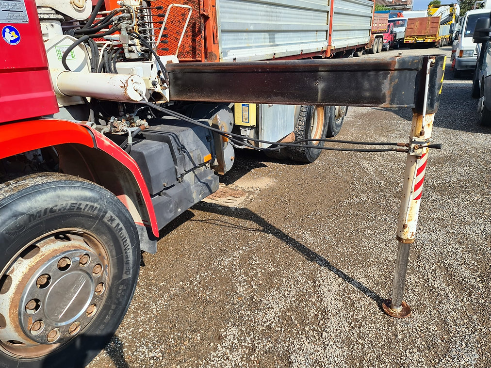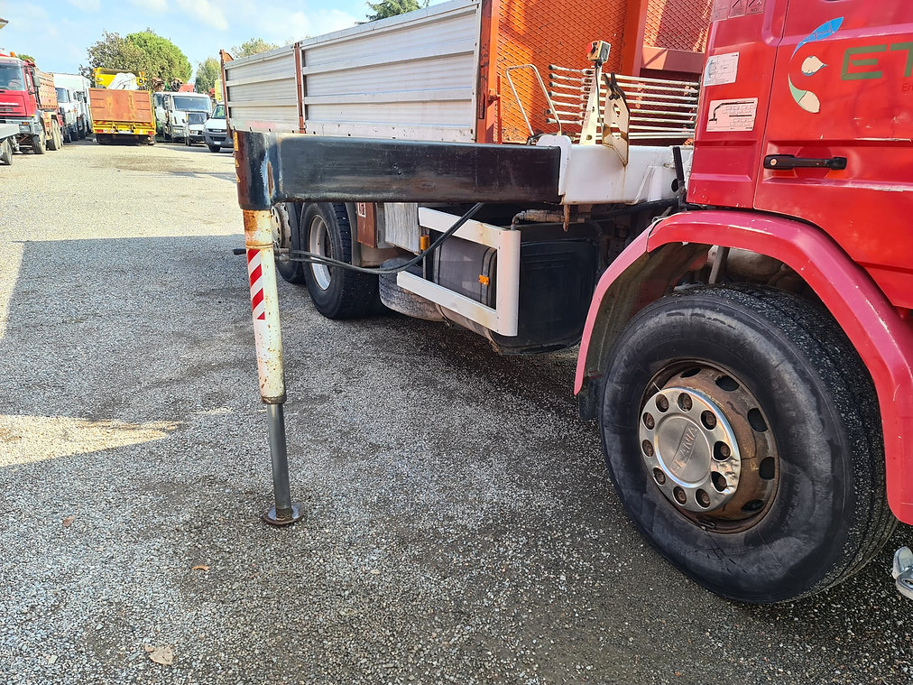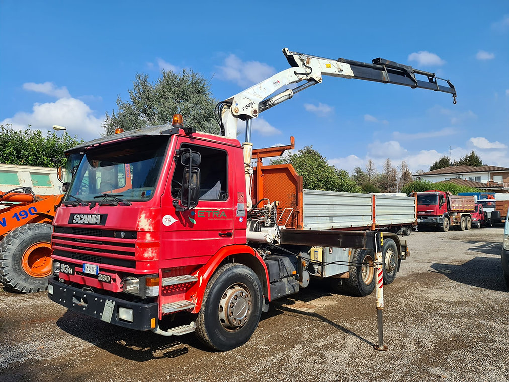 Autocarro SCANIA 93 H 280 3 assi con cassone ribaltabile e gru retrocabina BONFIGLIOLI P15000L/4SI con due piedi stabilizzatori, terzo asse sollevabile, misure del cassone sono: