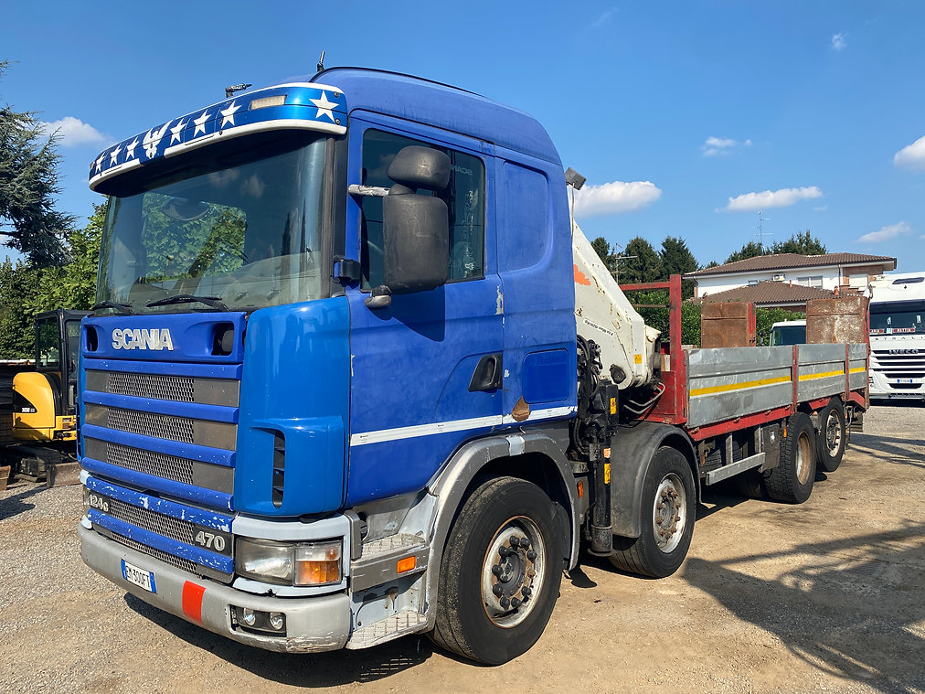 Autocarro SCANIA 124 G 470 CV 8X2 4 assi pianale con doppia rampa idraulica in discrete condizioni