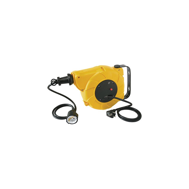 Corpo resistente in polipropilene. Roll-up automatico con molla a spirale dotata di dispositivo di blocco. Completo di staffa di fissaggio girevole a muro. Cavo da N°XMMQ 3X1.5 Con presa e spina schuko 2P da 16A. Con disgiuntore termico.MT10.