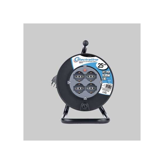 Con cavalletto metallico. Cavo 3G1,5 mm², spina 16A 2P+T, 4 prese schuko/bivalente 10/16A 2P+T, disgiuntore termico.