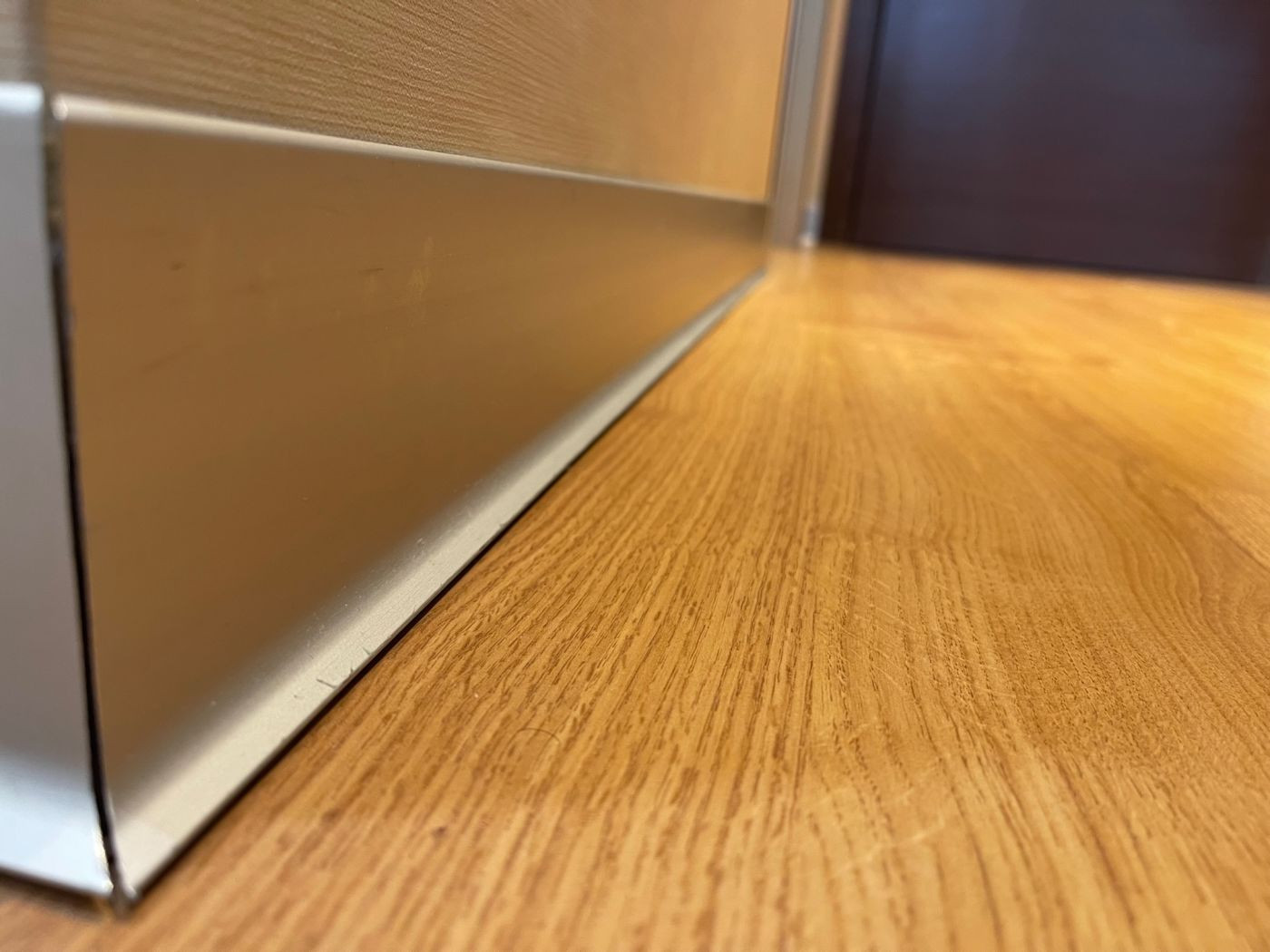 Battiscopa piatto dotato di sguscia inferiore da circa 10/11 mm, da applicare con silicone.