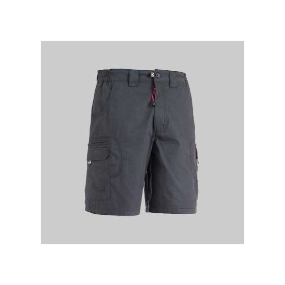 BERMUDA DA LAVORO GRIGIO Tg. L - In tessuto 100% cotone, peso 200 g/m2, passanti ed elastici in vita, due tasche con zip, tre tasche con velcro, due tasche anteriori, due tasche posteriori con velcro. Colore grigio.