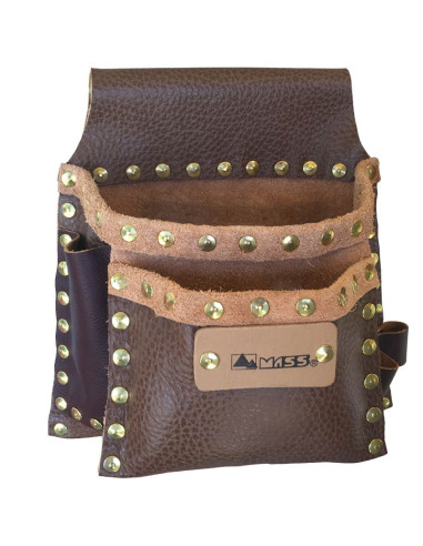 Borsa Carpentiere in pelle I° scelta Extra morbida, accuratamente rifinita a mano e completamente borchiata con rivetti dorati, tasca grande principale e tasca più piccola frontale, più tasche laterali per martello, tenaglia matite e doppiometro.