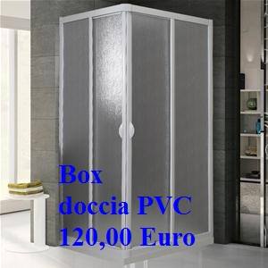 Box Doccia ad angolo 80x80 cm in PVC bianco con ante scorrevoli e pannello acrilico riducibile di 10 cm.