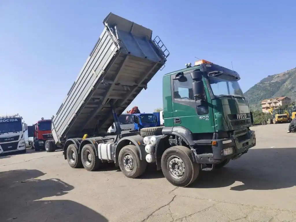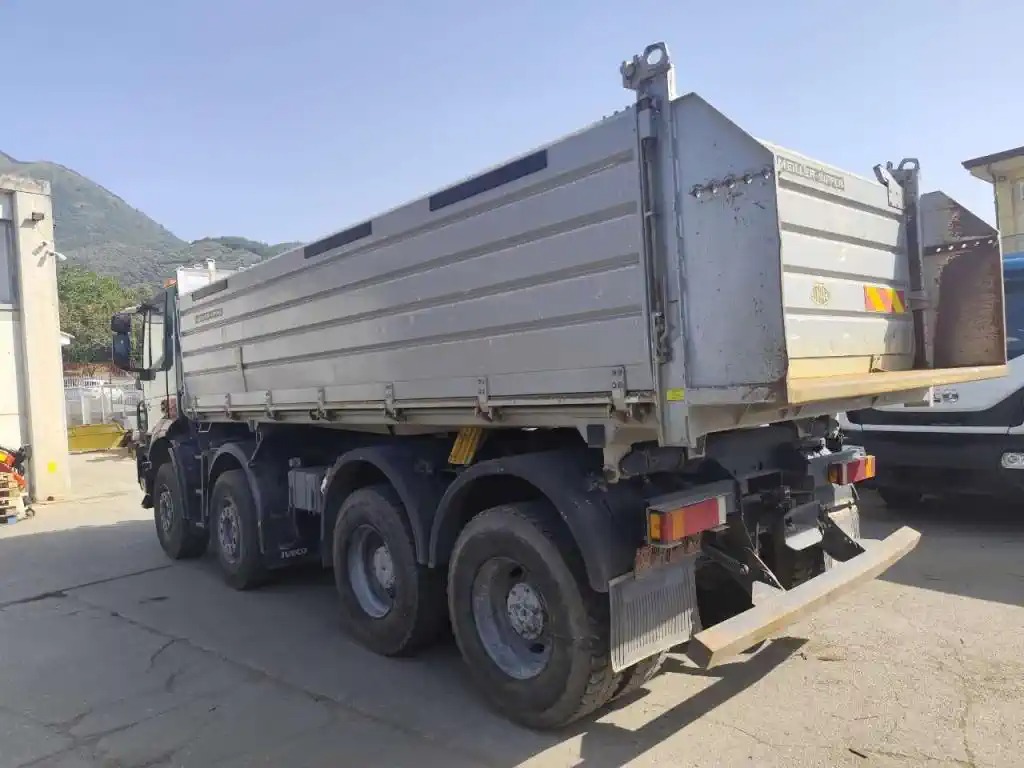Autocarro in ottime condizioni generali, ribaltabile trilaterale usato, 4 assi, configurazione 8x4, cambio manuale, Euro 5, sospensioni meccaniche, bloccaggio differenziale