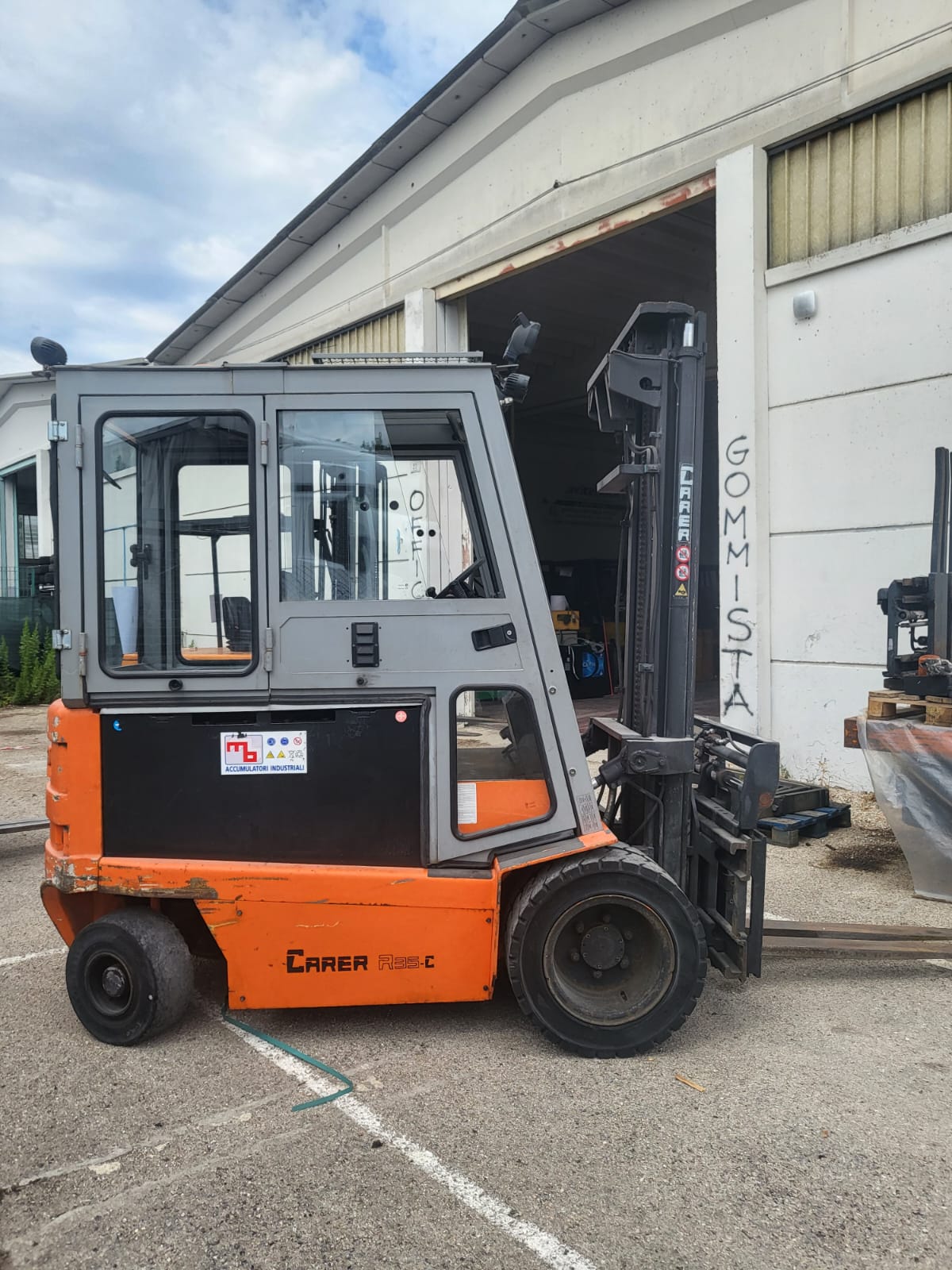 Carer mod.R35 C portata 3500 kg montante simplex con sollevamento ad oltre 4000 mm ingombro. Con posizionatore forche traslante e cabina completa.