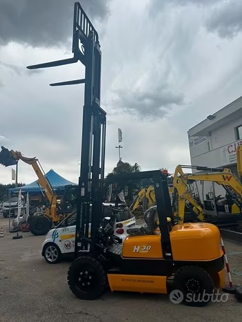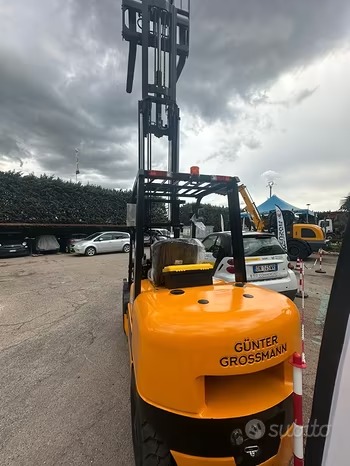 Portata nominale: 3000 kg Montante: Triplex Azionamento: C490BPG diesel Cambio: automatico Sollevamento:4500 mm Pneumatici: pneumatico Spostamento laterale delle forche integrato Specifica Tecnica Modello: Gunter Grossmann 3000 kg Cabina No Peso: 4270 kg Portata: 3000 kg Altezza di sollevamento: 4,50 m Albero: Triplex Tipo di pneumatici : Pneumatici Freno: pedale idraulico Batteria: V/AH 12/80 Motore: XINCHANG C490BPG Numero di cilindri: 4 Potenza di uscita nominale kw/rpm: 36,8/2650 Coppia nominaleN.m/rpm: 160/1800-1900 Capacità del serbatoio: 60L CAMPO DI FUNZIONAMENTO Velocità Km/h: 18/19 Velocità con carico mm/s: 440/480 Massimo. forza di trazione KN: 20/156 min. Raggio di sterzata: 2400 mm DIMENSIONI PRINCIPALI Lunghezza: 2682 mm Larghezza: 1225 mm Altezza: 2090 mm Dimensioni della forcella: 1200 mm x 120 mm x 40 mm.