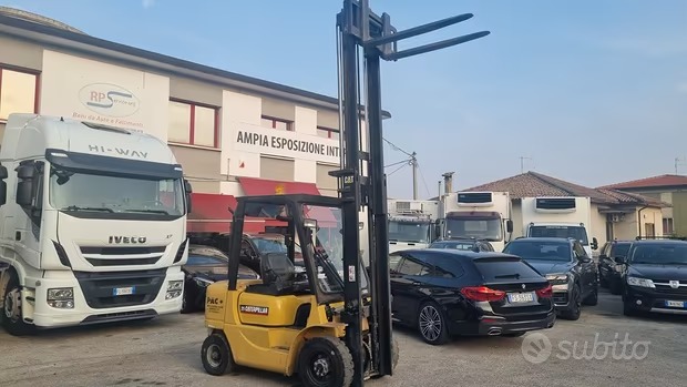 Vendo carrello elevatore diesel Caterpillar modello DP25K. Portata 2.500 kg. Anno 2001. Ore di lavoro 4.700. Montante muletto duplex altezza massima di sollevamento metri 3,80. Motore Mitsubishi 4 cilindri a gasolio. Prezzo netto i.e.. Per info 339 1952234 339 5814237.