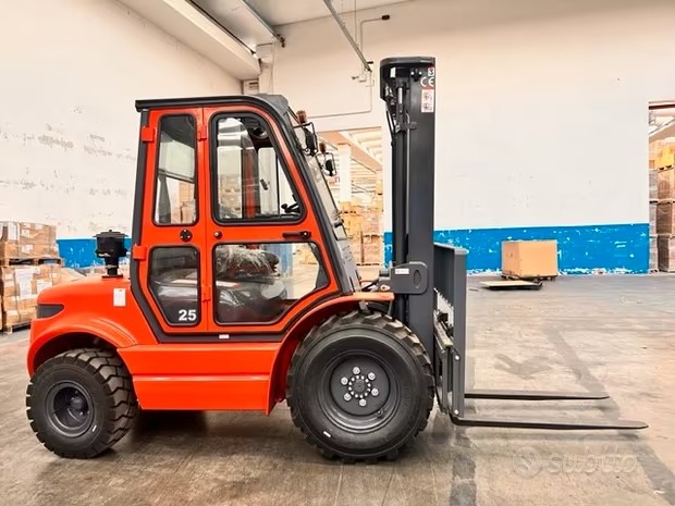 carrello elevatore fuoristrada 4x4 seminuovo 3000 kg traslatore montante triplex alzata libera cabina.