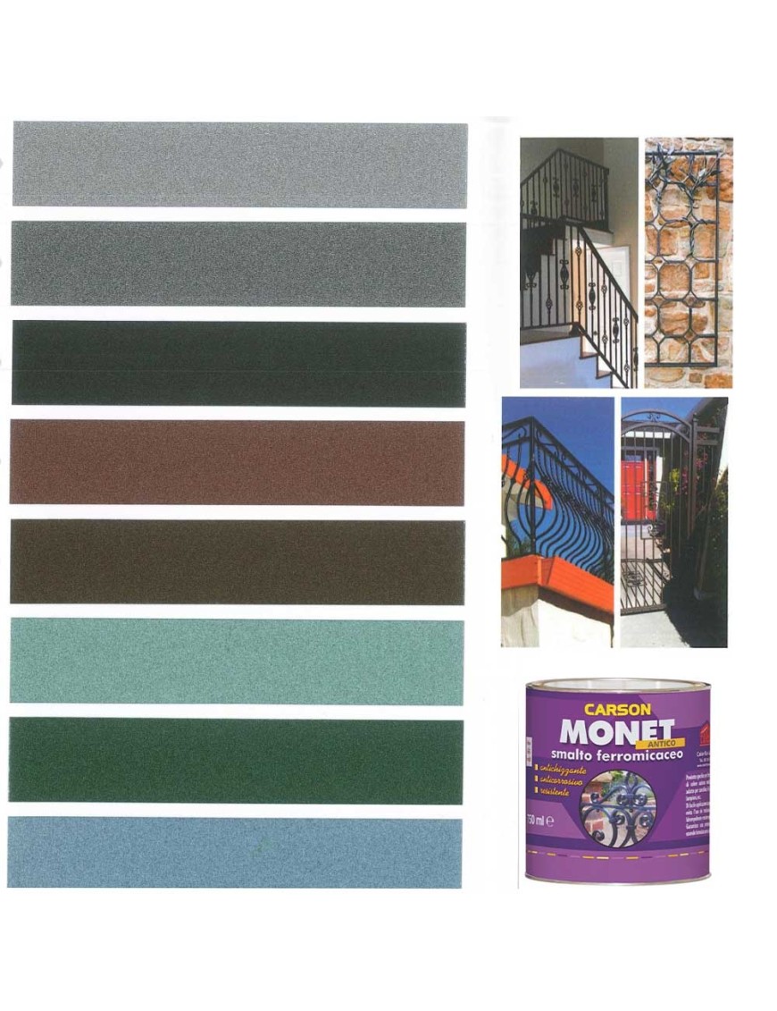 Carson monet antico è uno smalto specifico per il ferro ed il ferro battuto. Di colore satinato metallico. Di facile applicazione, evita l'uso dei tradizionali fondi antiruggine. Idrorepellente e resistente agli agenti atmosferici. Particolarmente adatto per cancellate, recinsioni, lampioni ecc. dove garantisce una protezione di lunga durata.