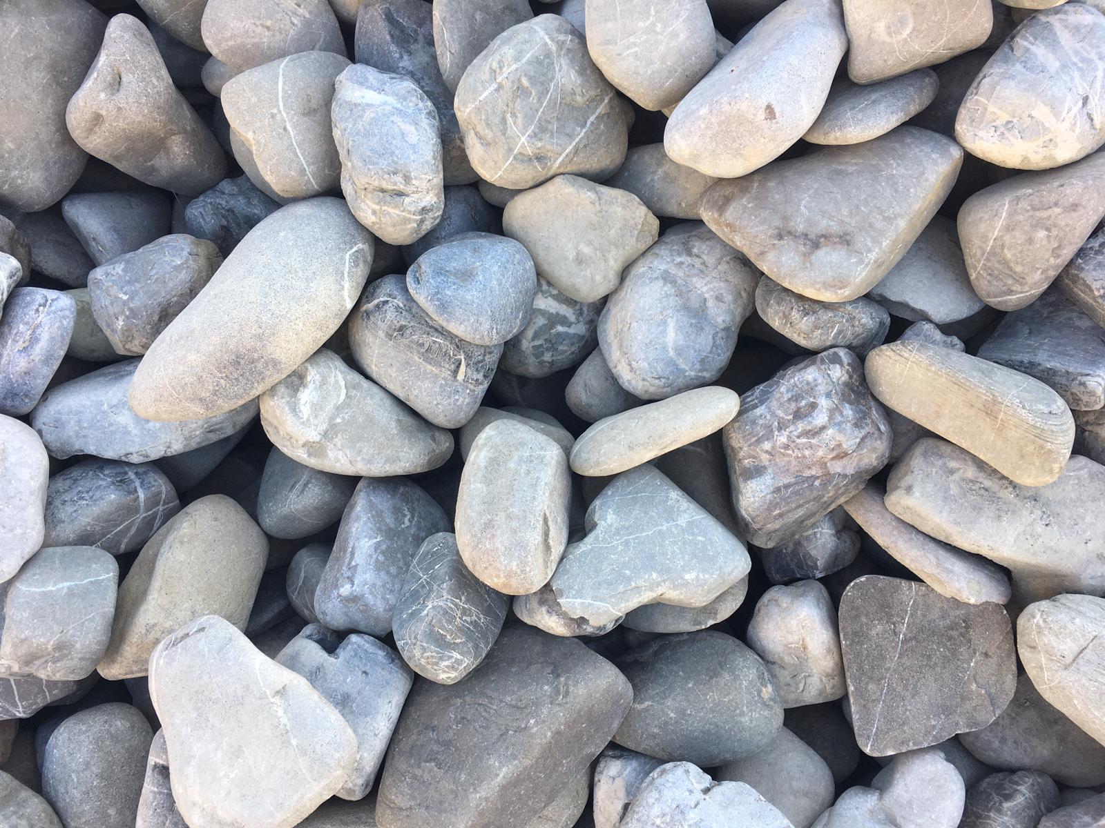 Ciottoli in pietra di fiume ornamentali, diametri: 8-12 mm, 12-23 mm, 23-30 mm, 30-40 mm, 50-100 mm, disponibili nel colore grigio tipico.
