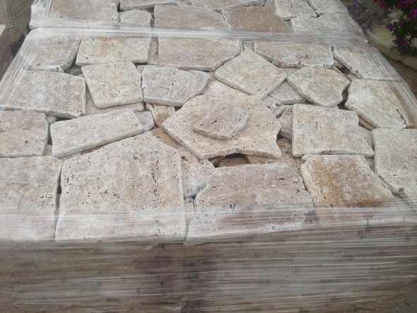 Cocciame di travertino noce Romano da rivestimento anticato, spessore 2 cm.