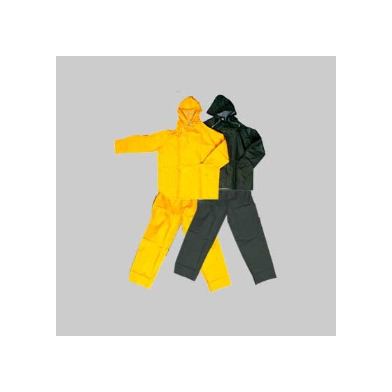 In PVC-poliestere-PVC, peso 390 g/m². GIACCA: cappuccio fisso, chiusura con cerniera ricoperta da patta e bottoni automatici, due tasche sul davanti con patta antipioggia, fondo manica con elastico stringipolso. PANTALONE: elastico in vita, apertura frontale con bottone automatico, bottoni automatici alle caviglie.