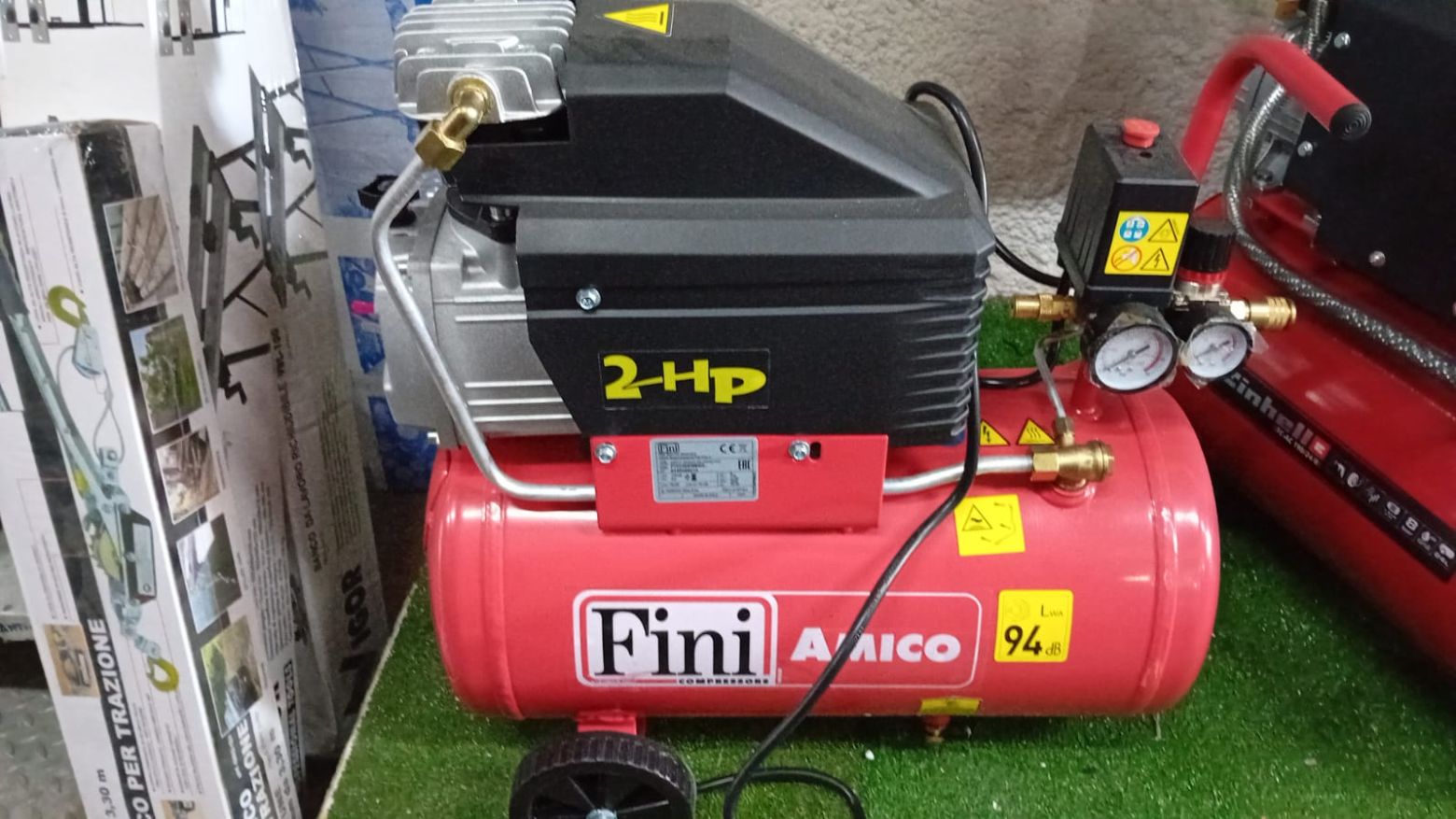 Compressore Fini semiproffesionale. Monostadio lubrificato. Serbatoio 25 litri. Motore 2 HP. Pressione 8 bar. Spedizione a parte.