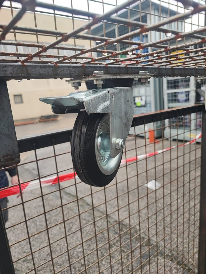 Cestoni metallici in rete pesanti con apertura frontale e ruote.