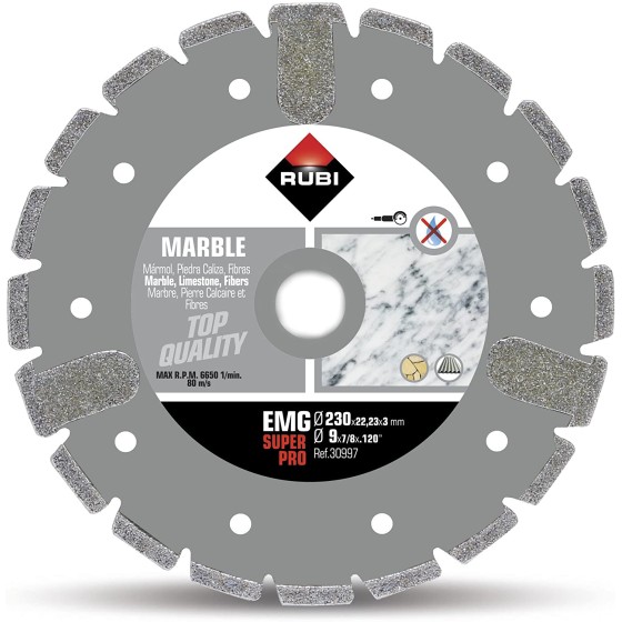 DISCO DIAMANTE MARMO EMG 230 SUPERPRO ideale per il taglio di marmo, pietre calcaree, fibre o materiali sintetici, per il taglio di tutti i materiali a forte rischio rottura durante il taglio, in particolare marmo o fibra di vetro.