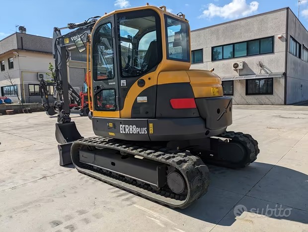 Escavatore VOLVO ECR88 PLUS, anno 2013, ore 4760, cingoli gomma, sgancio rapido idraulico con tre benne, imp. martello e pinza, CE, manuale d'uso. Macchina tagliandata in buono stato generale.