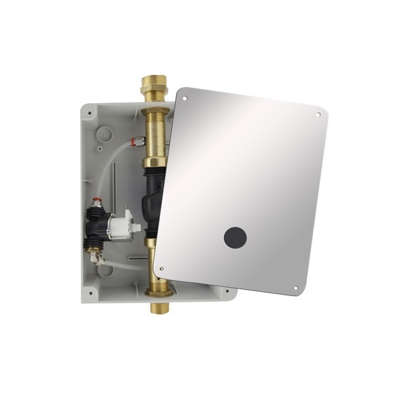 Flussometro da incasso per wc con comando a fotocellula funzionante a pile; il flussometro viene fornito di tutto quanto necessario per una corretta installazione: scatola da incasso con elettrovalvola, piastra in acciaio inox 230 x 180 con fotocellula e scheda elettronica, scatola porta pile, pile al litio 6 volt 1300 mAh(DianFlex)