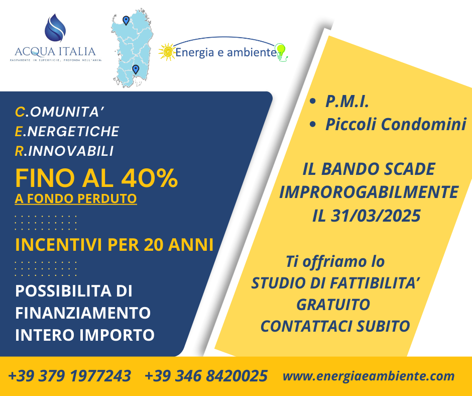 4 Febbraio 2025 Visualizzazioni: 372 ID: 20379 FONDO PERDUTO 40% COMUNITA’ ENERGETICHE RINNOVABILI Rapporto Segnala questa inserzioneAccesso richiesto Scaricamento Stampa Segnalibro Condividere Condividi questo annuncio Informazioni Categorie: Fotovoltaico, pannelli solari e pali eolici Indirizzo: Sardegna, Italia, , , Pubblica una nuova recensione Annulla rispostaYour Review Salva il mio nome, email e sito web in questo browser per la prossima volta che commento. La tua valutazione Title of your review: