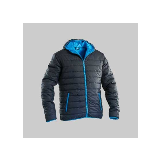 GIUBBINO IMBOTTITO CON CAPPUCCIO BLU Tg. L - Tessuto: 100% Nylon. Imbottitura: 140g/m². Slim fit. Chiusura centrale tramite cerniera a vista. Due tasche laterali con cerniera. Elastico in vita e ai polsi. Colore blu navy.