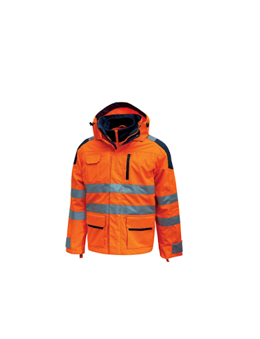 ESTERNO: Parka anti pioggia impermeabile e traspirante. Bande riflettenti applicate su busto, maniche e spalle. 2 ampie tasche frontali applicate sul fondo chiuse con velcro, 1 tasca sul petto lato sinistro chiusa con zip idrorepellente e 1 tasca sul petto lato destro chiusa con zip e coperta da pattina e sormontata da 1 tasca porta cellulare. Tasca multimediale interna con uscita per auricolare tecnologia Free Sound, tasca interna supplementare. Chiusura centrale con zip ricoperta da paramontura frontale. Cappuccio regolabile e staccabile. Caldo e confortevole micro-fleece sul colletto. Doppio tessuto di rinforzo su gomiti. INTERNO: Corpetto termico con maniche staccabili. Bande riflettenti su busto, maniche e spalle. 2 tasche sul fondo chiuse con zip e una tasca sul petto lato destro chiusa con zip. Polsini e collo in morbide e robuste costine elasticizzate. Chiusura centrale con zip. Su polsini e collo fettuccia per agganciare il corpetto interno al parka esterno.