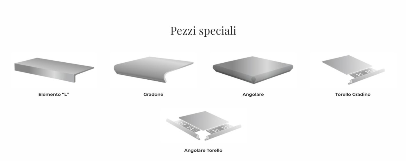 Disponibili battiscopa, elementi a elle e gradini per scale con toro incollato e anche monolitici.
