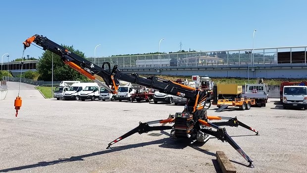 Gru compatta cingolata mod. M250 Carro cingolato allargabile, Cingoli in gomma nera, Motoriduttori epicicloidali con freno negativo, Motore diesel Yanmar a 3 cilindri, raffreddato a liquido, Stabilizzatori a zampa regolabili, Rotazione continua con ralla e giunto rotante idraulico ed elettrico, Braccio telescopico con n°3 stadi sfilati con rinvii a catena, Radiocomando a 6 funzioni, Limitatore di carico e di stabilizzazione controllato elettronicamente con display Circuito idraulico con pompe idrauliche e distributore Hawe proporzionale multifunzione compensato, Ganci di sollevamento e fissaggio per il trasporto, Verniciatura bracci e carro di colore nero, fregi e martinetti arancione. OPTIONALS:Verricello idraulico Rotzler 1000 kg installato sotto il braccio telescopico con carrucole per tiro diretto, lunghezza fune 65 m, Sistema di carrucole per tiro in terza, Carrucole per tiro in punta al jib, Jib meccanico telescopico con angolo regolabile, Jib idraulico mod. J150C con n°2 sfili idraulici ed articolazione idraulica di 195° completo di gancio, Testata porta gancio ribassata con spinatura regolabile in punta alla gru, Testata porta gancio ribassata con spinatura regolabile in punta al jib, Elettropompa 220 V monofase 2,2 kw con inverter e quadro di controllo, Maggiorazione per cingoli antitraccia. Spedizione a parte.