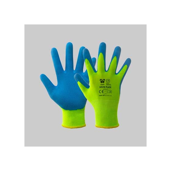 GUANTO PROFESSIONALE 'HIVE FLEX' NERI Tg. 8 - Supporto in poliestere leggero, flessibile e traspirante, per una perfetta vestibilità e comfort. Spalmatura sul palmo in lattice schiumato con finitura a rilievo (disegno a nido d'ape), per una presa eccellente e proprietà antiscivolo superiori. Il lattice schiumato mantiene la dita flessibili anche a temperature inferiori allo zero. Colore fluo che favorisce l'utilizzo anche in condizioni di scarsa visibilità. Buona resistenza all'abrasione. Forma ergonomica, assenza di cuciture, ottimo comfort di calzata. Polso elasticizzato e dorso aerato. Colore: blu, giallo fluo.