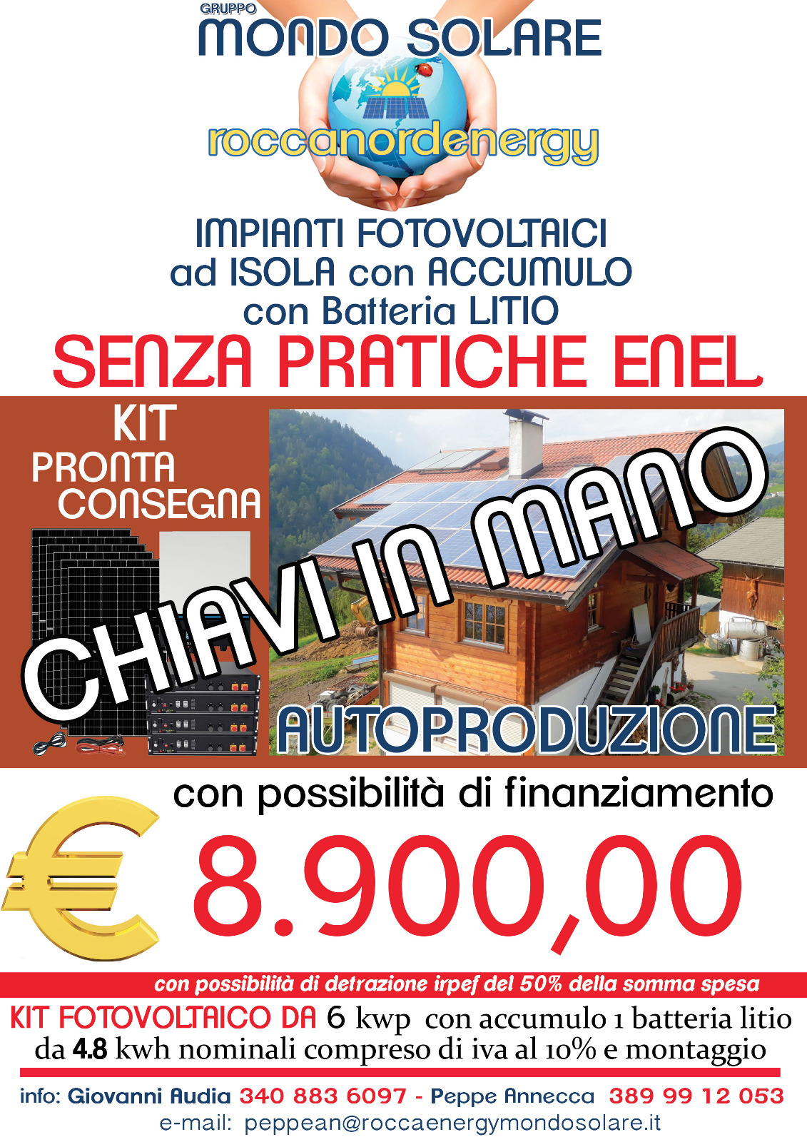 Kit FOX allacciato in rete chiavi in mano impianto fotovoltaico 3.280 kwp accumulo 5.8 kwh Litio Grazie alla potenza dell'inverter fox e alla longevità dell'accumulo kwh 5,8 al LiFePo04, FOX il KIT 3.280 kwp è perfetto per alimentare un'intera abitazione per molto tempo. Con il kit ad isola è possibile utilizzare detrazione fiscale IRPEF 50% recuperare il 50% della spesa sostenuta in 10 anni sulle proprie tasse Possibile avere finanziamento pagare con comode rate Il kit è composto da: • Numero 8 pannelli 410 w Longi o ECO DELTA • Inverter ibrido FOX 3 kw - Numero 1 × Batterie Litio 2.9 kWh - Numero 1 BMS che funge da batteria da 2.9 kwh accumulo totale 5.8 kwh - Cavi specifico per collegamento inverter batterie e cavo lan - Quadro CC 2 stringhe - Quadro CA - Cavo solare 6 mm 50+50 da 6 mm - Struttura fissaggio pannelli Escluso progetto Enel e pratica Gse costo 300 euro