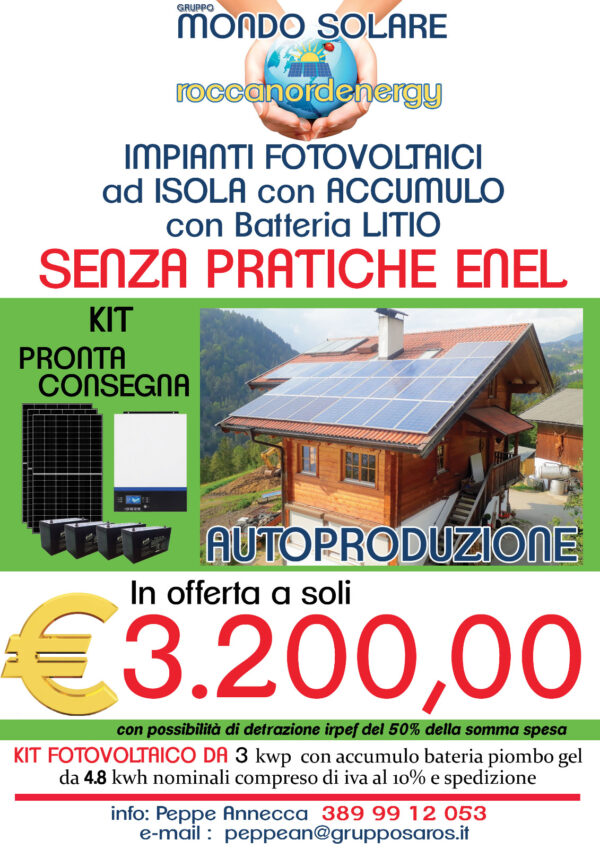 Fornitura Impianto fotovoltaico ad isola con accumulo SENZA PRATICA ENEL autoproduzione indipendente. Con il kit fotovoltaico KIT 3.280 kwp è possibile realizzare un impianto ad isola da circa 3.280 kWp completo di inverter ibrido "All in One" onda pura da ben 3000 W 24 v con controllo remoto bluetooth e wifi, con accumulo utile di 4.8 kWh batterie piombo gel Ultimatorn o FAAM numero 4 batterie 100 ah 12 v accumulo nominale 4.8 kw Con il kit ad isola è possibile utilizzare detrazione fiscale IRPEF 50% recuperare il 50% della spesa sostenuta in 10 anni sulle proprie tasse , Con i kit ad isola non occorre fare pratica Enel e Gse, poichè non immettono corrente in rete essedo autoproduzione ups. Funzionamento Impianto ad isola : produce la corrente, alimenta l' abitazione, la corrente in esubero carica le batterie, di sera all'imbrunire quando impianto non produce più passa automaticamente prelevando la corrente accumulata nelle batterie, qualora le batterie si scaricassero inverter è dotato di uno swich all'interno blocca le batterie e preleva la corrente direttamente dal contatore enel, e/o in assenza di utenza Enel può essere collegato ad un gruppo elettrogeno. Inverter ha una particolarità se ci fosse un black out va via la corrente impianto ad isola continua a funzionare di giorno e di notte essendo ibrido ups. Si fornisce schema di montaggio e assistenza telefonica durante installazione e configurazione inverte e batterie. Il kit è composto da: • Numero 8 pannelli 410 w ECO DELTA • Inverter ibrido ad isola un uscita 3000 W 24 V con 1 regolatori di carica MPPT da 500V - 4 Batterie PIOMBO GEL 100 AH 12 V accumulo 4.8 kWh nominali - Protezioni batterie , stacca batterie, fusibile, porta fusibile, lamelle in rame, morsetti cavo collegamento 6 mt da 25 mm - Quadro CC 1 stringhe - Commutatore automatico - Cavo solare 6 mm 50+50 da 4 mm