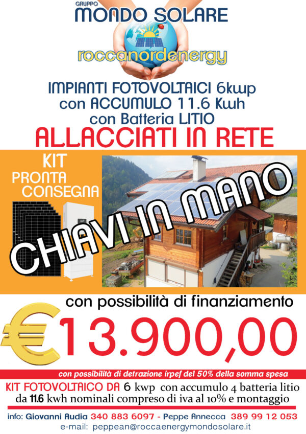 Impianto fotovoltaico ALLACCIATO IN RETE KIT 6.160 kwp accumulo 11.6 kwh sistema FOX garanzia Italia 10 anni inverter 10 anni batterie , pannelli 12 anni prodotto 25 anni la resa. Grazie alla potenza dell'inverter e alla longevità dell'accumulo al LiFePo04, il KIT FOX 6.160 kwp con accumulo 11.6 kwh è perfetto per alimentare un'intera abitazione per molto tempo. Con il kit fotovoltaico è possibile utilizzare detrazione fiscale IRPEF 50% recuperare il 50% della spesa sostenuta in 10 anni sulle proprie tasse ,Possibile avere finanziamento pagare con comode rate. Il kit è composto da: • Numero 14 pannelli 440 w Longi • Inverter ibrido FOX 6 kw - Numero 3 batterie Litio 2.9 kWh - Numero 1 Bms da 2.9 kwh che finge da batteria acculo totale 11.6 kwh - Cavi specifico per collegamento inverter batterie e cavo lan - Quadro CC 2 stringhe - Quadro CA - Cavo solare 6 mm 50+50 da 6 mm - Struttura fissaggio pannelli costo compreso iva 10% e montaggio Escluso progetto elettrico Enel e pratica GSE costo 300 euro