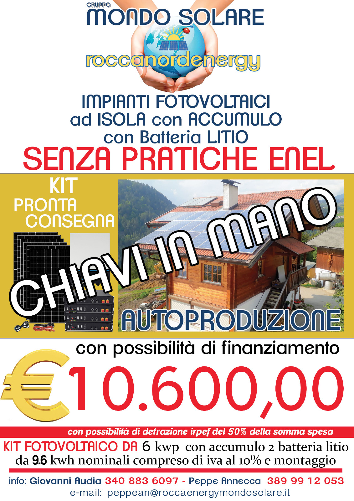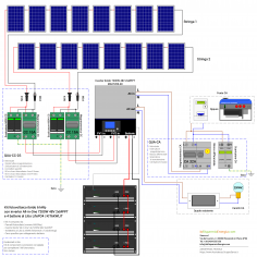 Con il kit fotovoltaico KIT 6,160M kwp è possibile realizzare un impianto ad isola da circa 6 ,160 kWp completo di inverter ibrido "All in One" onda pura da ben 7200W con controllo remoto bluetooth e wifi, con accumulo utile di 9,6 kWh Pylontech us 5000 grazie a 2 batterie litio ferro fosfato da 4.8 kWh. Grazie alla potenza dell'inverter e alla longevità dell'accumulo al LiFePo04, il kit KIT6KWLIT è perfetto per alimentare un'intera abitazione per molto tempo. Con il kit ad isola è possibile utilizzare detrazione fiscale IRPEF 50% recuperare il 50% della spesa sostenuta in 10 anni sulle proprie tasse , Impianto è modulare si possono aumentare altre batterie per avere maggiore accumulo, altrettanto con i pannelli si possono aumentare fino a 7,2 kw , tuttavia acquistando un' altro inverter si può aumentare impianto fino a 14 kwp Con i kit ad isola non occorre fare pratica Enel e Gse, poichè non immettono corrente in rete essedo autoproduzione ups. Funzionamento Impianto ad isola : produce la corrente, alimenta l'abitazione, la corrente in esubero carica le batterie, di sera all'imbrunire quando impianto non produce più passa automaticamente prelevando la corrente accumulata nelle batterie, qualora le batterie si scaricassero inverter è dotato di uno swich all'interno blocca le batterie e preleva la corrente direttamente dal contatore enel, e/o in assenza di utenza Enel può essere collegato ad un gruppo elettrogeno. Inverter ha una particolarità se ci fosse un black out va via la corrente impianto ad isola continua a funzionare di giorno e di notte essendo ibrido ups. Si fornisce schema di montaggio e assistenza telefonica durante installazione e configurazione inverte e batterie. Il kit è composto da: • Numero 14 pannelli 440 w Longi • Inverter ibrido ad isola un uscita 7200W 48V con 2 regolatori di carica MPPT da 500V - 2 × Batterie Litio 4.8 kWh Pylontech us 5000 - Cavi specifico per collegamento inverter batterie e cavo lan - Quadro CC 2 stringhe - Quadro CA - Cavo solare 6 mm 50+50 da 6 mm - Commutatore automatico - Struttura fissaggio pannelli Escluso progetto Enel e pratica Gse costo 300 euro