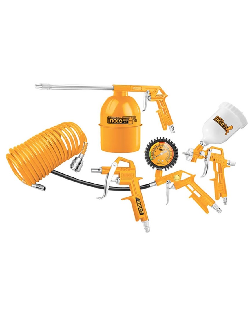 Ingco AKT0053 รจ un set di accessori professionali per il compressore da 5 pezzi composto da aerografo, tubo spiralato, pistola lavaggio, soffiaggio e gonfiaggio.
