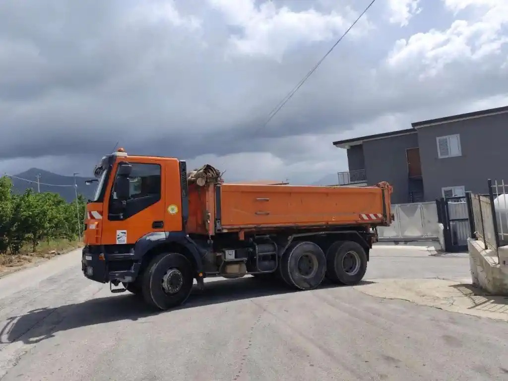 Autocarro in ottime condizioni generali, ribaltabile con sponda sx ad apertura idraulica, 3 assi, configurazione assi 6x4, Euro 5, cambio manuale, balestrato, bloccaggio differenziale