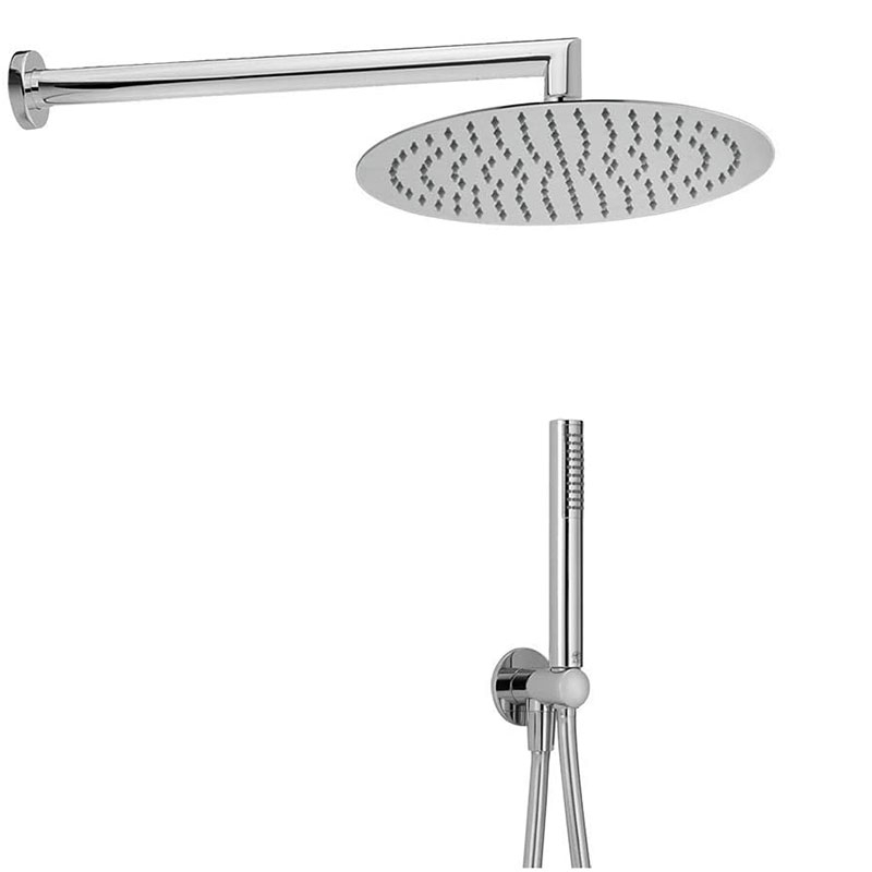 Kit braccio doccia con presa d’acqua ,braccio doccia L.350 mm ,soffione tondo D.250 mm SP.2mm in INOX ,doccetta monogetto minimale in ABS ,presa d’acqua 1/2″ ,flessibile liscio SILVERFLEX 150 cm.