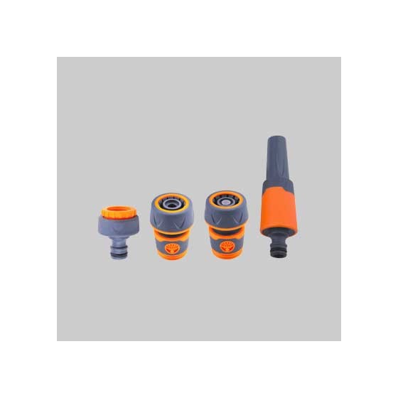 KIT LANCIA A SPRUZZO 3/4" set 4 pezzi - Composto da: lancia a spruzzo, presa rubinetto 3/4"F con riduttore 1/2", raccordo rapido e raccordo rapido 'acquastop'. Confezione blister.