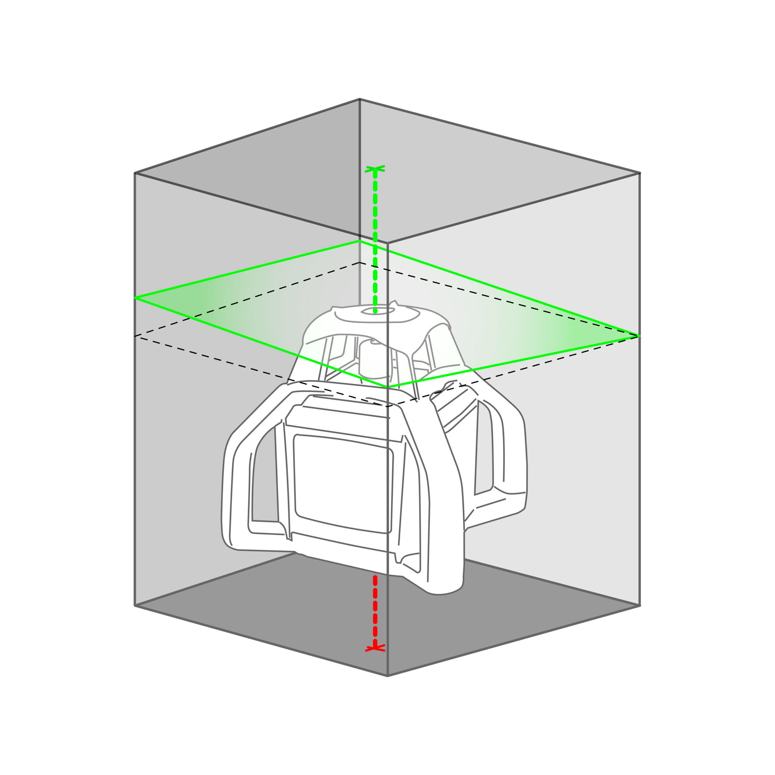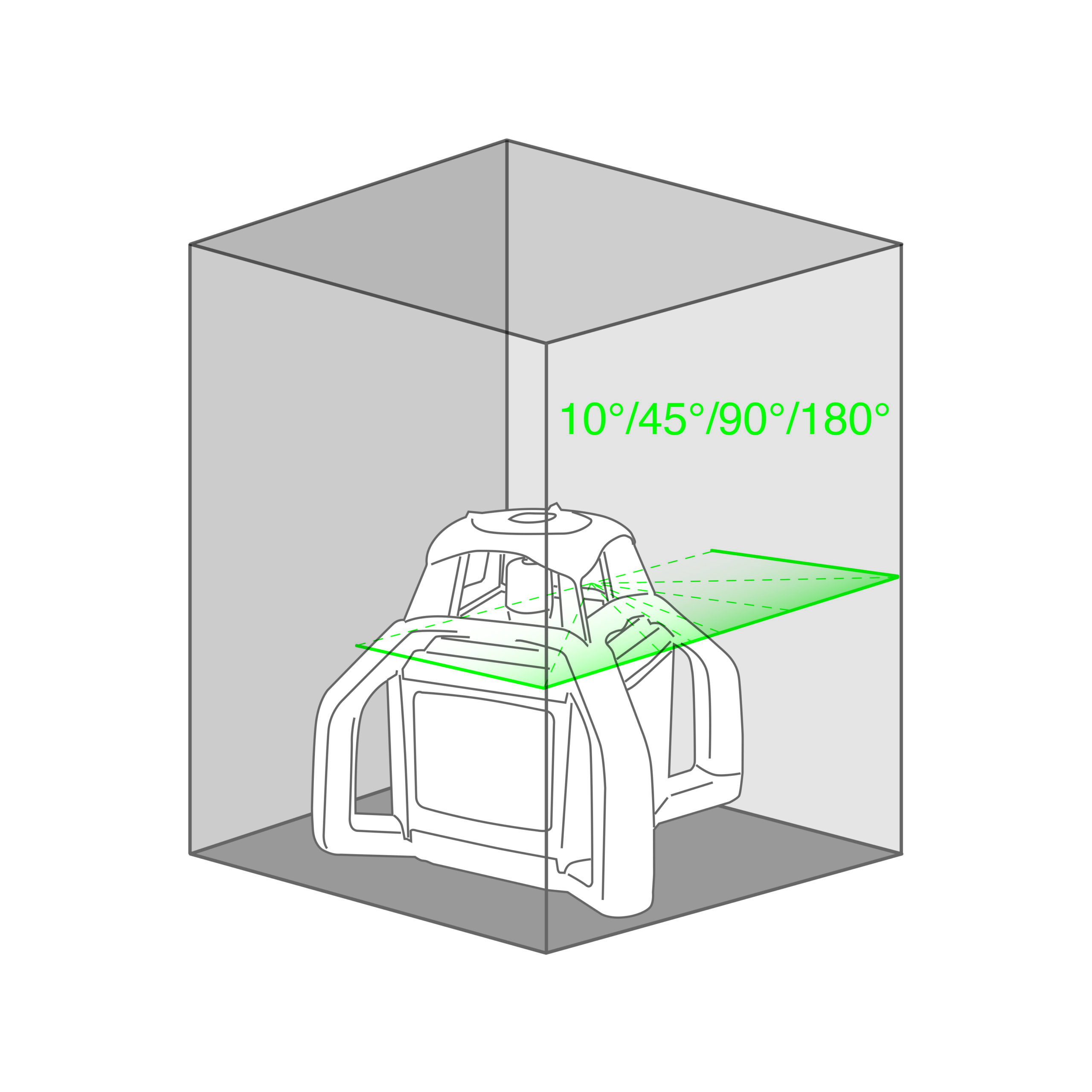 - Ruotando l’apparecchio di 90°, genera un piano laser verticale autolivellato e un raggio orizzontale