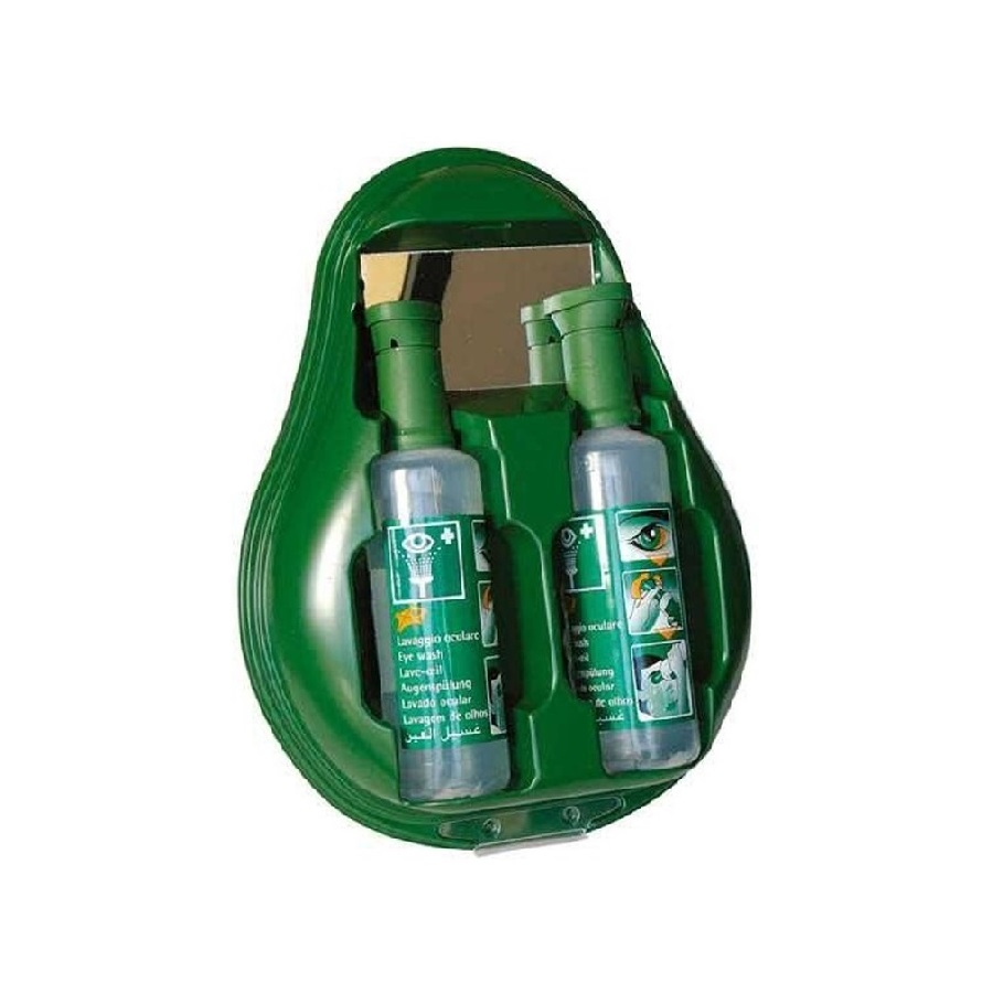 Flacone dotato di spruzzatore, dispenser a muro con specchio, ideale per un primo lavaggio oculare. Comprende viti e tasselli.