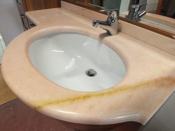 Questo lavabo in marmo si contraddistingue per le sue sfumature che tendono al rosa confetto. E’ possibile acquistare, oltre al piano, la struttura portante del mobile da bagno che ospita dei vani inferiori e laterali alla struttura del lavabo.