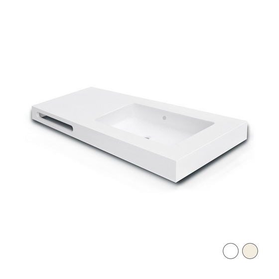 Lavabo Linea Emotion installazione sospesa. Materiale: miscela di resine al poliestere e fibre minerali di ultima generazione. Finitura: effetto pietra. Superficie liscia. Vasca a DX e porta asciugamani a SX. Con foro troppo pieno. Per installazione, staffe consigliate nostro art. 214-M2056. Set collegamento troppo pieno consigliato nostro art. 371-V900199.