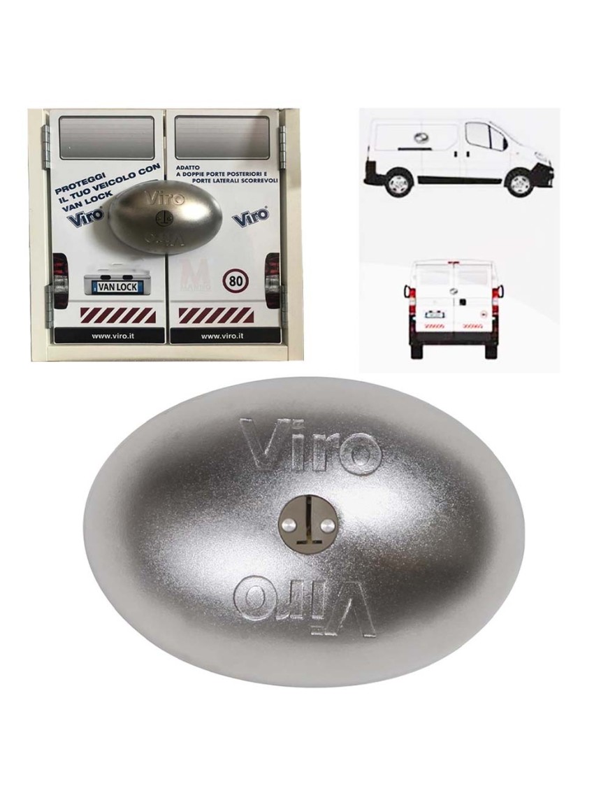Viro Van Lock è un lucchetto di sicurezza per portelloni e portiere di furgoni, camper, van ecc. installabile praticamente in ogni situazione, in quanto tollera o recupera (con spessori) eventuali disallineamenti delle ante, si chiude con facilità a spinta ed offre un elevato grado di sicurezza grazie al sistema di fissaggio, alla chiave a 7 pistoncini ed alla piastrina antitrapano.