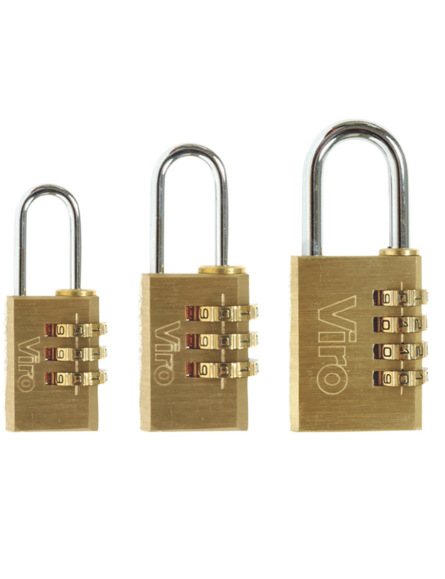 Viro Lucchetto in ottone a combinazione variabile con corpo robusto e arco in acciaio temprato. Facile da usare, senza chiave, ideale per armadietti, valigie, cassette e zaini. Codice personalizzabile a 3 o 4 cifre (in base al prodotto scelto) per maggiore sicurezza e praticità.