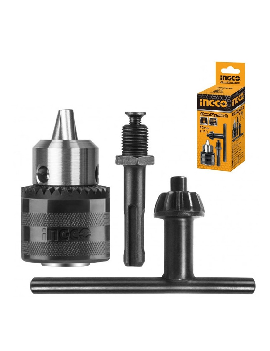 Set professionale pronto all'uso composta da un mandrino INGCO da 1,5 a 13 mm, una chiave e un adattatore utili all'installazione.