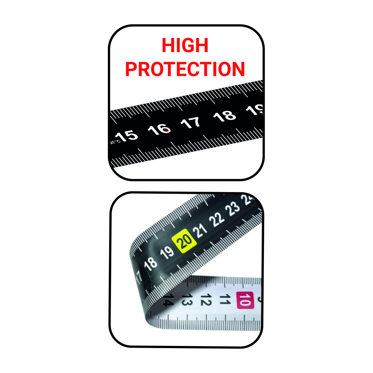 - Nastro laccato: Fronte nero numerazione orizzontale con decimali gialli ad alta visibilità Retro bianco numerazione verticale con decimali rossi