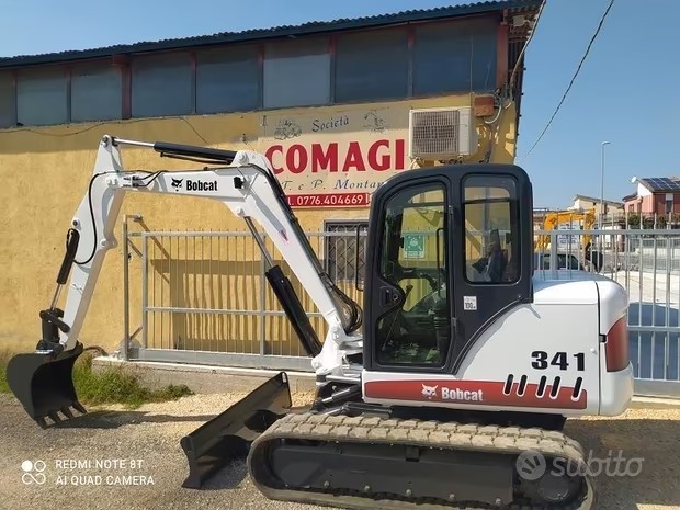 MINI ESCAVATORE BOBCAT 341 , ANNO 2005, peso Kg 5300, cabina chiusa completa di riscaldamento, motore KUBOTA 4 cilindri turbo diesel, pompa a portata variabile, doppia velocità di traslazione, impianto martello, macchina controllata pronta per il lavoro. Completa di certificato ce + manuale uso e manutenzione. Per maggiori informazioni telefonare allo 0776404669 COMAGI s.r.l. sito internet scrivere comagi.