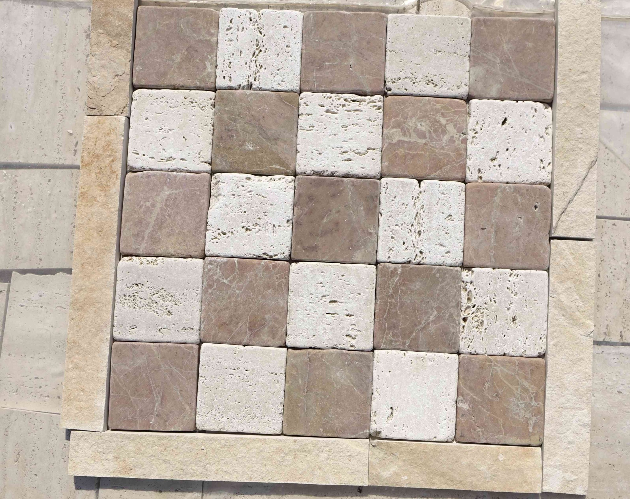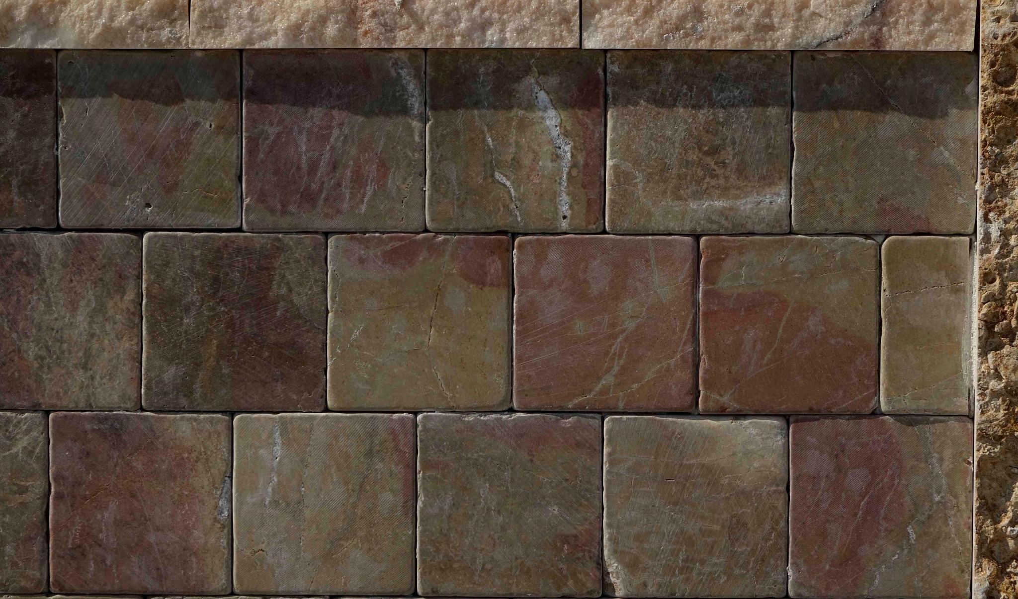 Mosaico di piastrelle in pietra da rivestimento anticate segate, formato 10x10x1 cm.