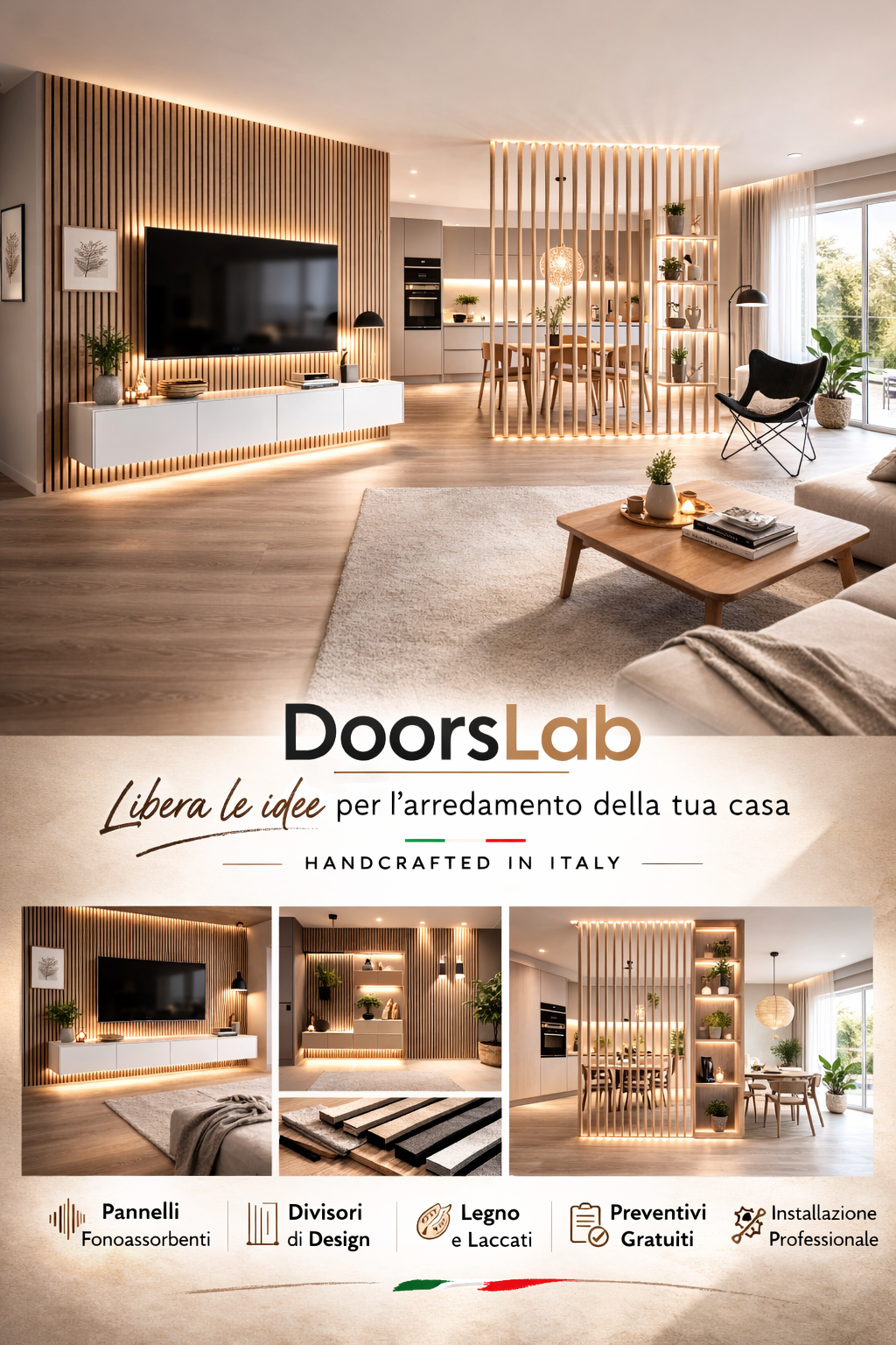 Pannelli Fonoassorbenti e Divisori di Design – Funzionalità ed Eleganza per Ogni Ambiente Vendiamo e installiamo pannelli acustici fonoassorbenti e pareti divisorie d’arredo, soluzioni moderne e versatili per migliorare il comfort acustico e valorizzare gli spazi. Le nostre soluzioni sono ideali per: ✔ Entrate ✔ Soggiorni ✔ Cucine ✔ Corridoi ✔ Camere ✔ Ambienti open space Offriamo un’ampia gamma di finiture: • Pannelli acustici disponibili in diverse essenze di legno e laccati tinta unita • Pareti divisorie in rovere naturale con doghe verticali, personalizzabili anche con ripiani integrati Seguiamo ogni progetto con attenzione e competenza, offrendo: ✅ Preventivi gratuiti ✅ Sopralluoghi dedicati ✅ Installazione professionale Operiamo nelle province di Venezia (VE), Treviso (TV), Pordenone (PN) e Udine (UD). Con oltre trent’anni di esperienza, garantiamo massima serietà, qualità dei materiali e cura nei dettagli. DoorsLab è il punto di riferimento per un arredo smart: qualità, design e giusto prezzo.