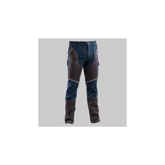 PANTALONE DA LAVORO STRETCH BLU Tg. S - In tessuto 98% cotone e 2% elastico, peso 200 g/m2, elasticizato (slim fit), chiusura centrale con cerniera e bottone, elastico ai fianchi, passanti in vita per cintura di cui uno in colore fluo, due tasche principali, due tasche posteriori di cui una con pattina, tasca porta metro (gamba destra). Colore blu navy.