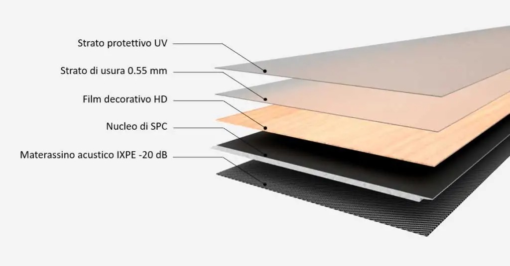 - Un nucleo portante in SPC, materiale che nasce dall’unione di polimeri di cloruro di vinile (PVC) e polvere minerale